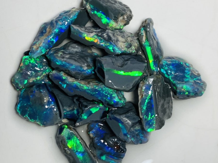 Lightning Ridge Rough Seam Opal Parcel 140cts Black & Dark with lots Potential & some Cutters Lots Bright Multi colours 20x8x4mm to 7x6x2mm NSW005