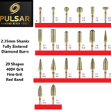 PULSAR DIAMOND® Full Set of 20 shapes 400#Grit Fine Red Band Fully Sintered Diamond Burr 2.35mm Shank for grinding Opal & Gemstones, Glass, Stone, Metal Polishing Fits Dremel Foredom & Pulsar tools