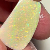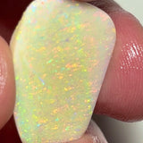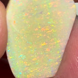 A stunning big-sized seam opal rub from Lightning Ridge, showing bright yellow and orange dominant fires with a beautiful confetti/floral pattern across the face. Already shaped and ready for final polish and setting. Perfect for creating a bold jewellery piece with vibrant warm tones and lively surface play.
