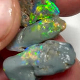 Bright Allawah knobby opal rough trio, totalling 12.00cts. Two pieces feature dominant orange fire, while all three display blue fire across the surface. Thin knobby profiles make these well-suited for skilled cutters chasing clean, bright face material. Nice play-of-colour and good shapes for small finished stones.