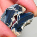 This large-sized black knobby opal split pair from Lightning Ridge features thin bars with some blue fire waiting to be chased, making it an exciting challenge for lapidaries. With its natural split and deep black base, this opal holds the potential for cutting and uncovering hidden brilliance.
