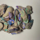 Beautiful parcel of Lightning Ridge opal rough featuring a mix of knobby and seam material. Weighing in at 175 carats, this lot includes pieces showing bright multicolour play, with rare pinks and reds visible on several stones. Great variety of thicknesses and face orientations — perfect for cutters seeking exciting polish potential and colour play across different base types.