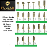 PULSAR DIAMOND® Full Set of 22 shapes 100#Grit Coarse Green Band Fully Sintered Diamond Burr 2.35mm Shank for grinding Opal & Gemstones, Glass, Stone, Metal Polishing Fits Dremel Foredom & Pulsar tools